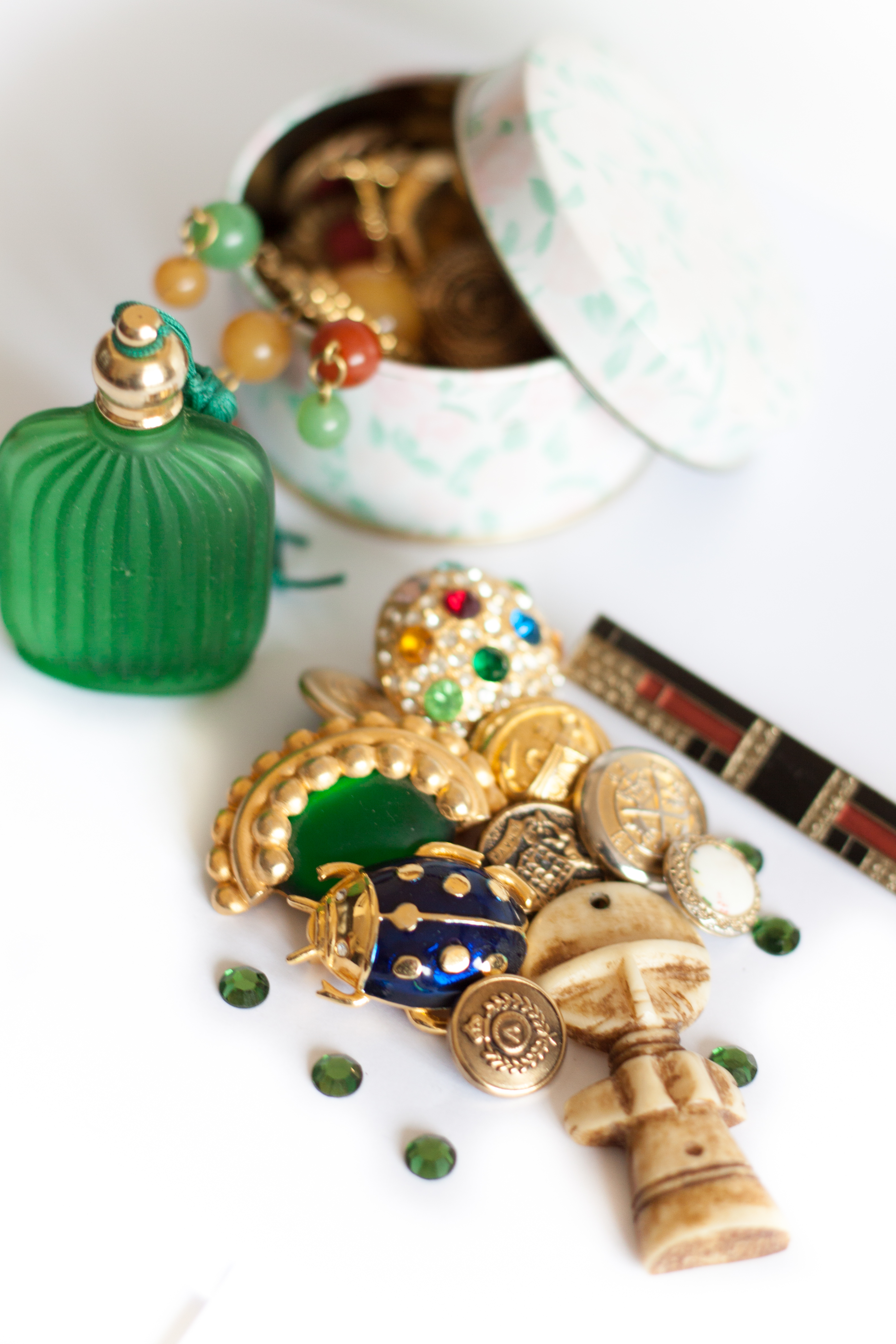 J’adorais ça, fouiller. Attention, je n’ai jamais rien pris (du moins sans autorisation) , mais j’attendais par exemple que mes grand-parents fassent la sieste pour me ruer vers le Grenier et entamer une petite chasse aux trésors tout l’après midi en essayant de ne pas me faire choper. Parce que bon, va-t-en expliquer qu’à l’âge de 5 ou 6ans, ton gros kiffe dans la vie , c’est de farfouiller partout, juste pour le plaisir de tomber sur ce que tu désignes de tes mains poussièreuses et de ta voix de crécelle comme étant « Des Trésors« ( » Mon précieuuuuux ! »). Un flacon de parfum qui pue le vieux , un bouton super sale, une broche cassée, des pièces trouées, des livres qui sentent le grenier…. Autant de trésors que je ramenais chez mes parents (Ô joie) lorsque les propriétaires m’avaient donné la permission de les emporter.