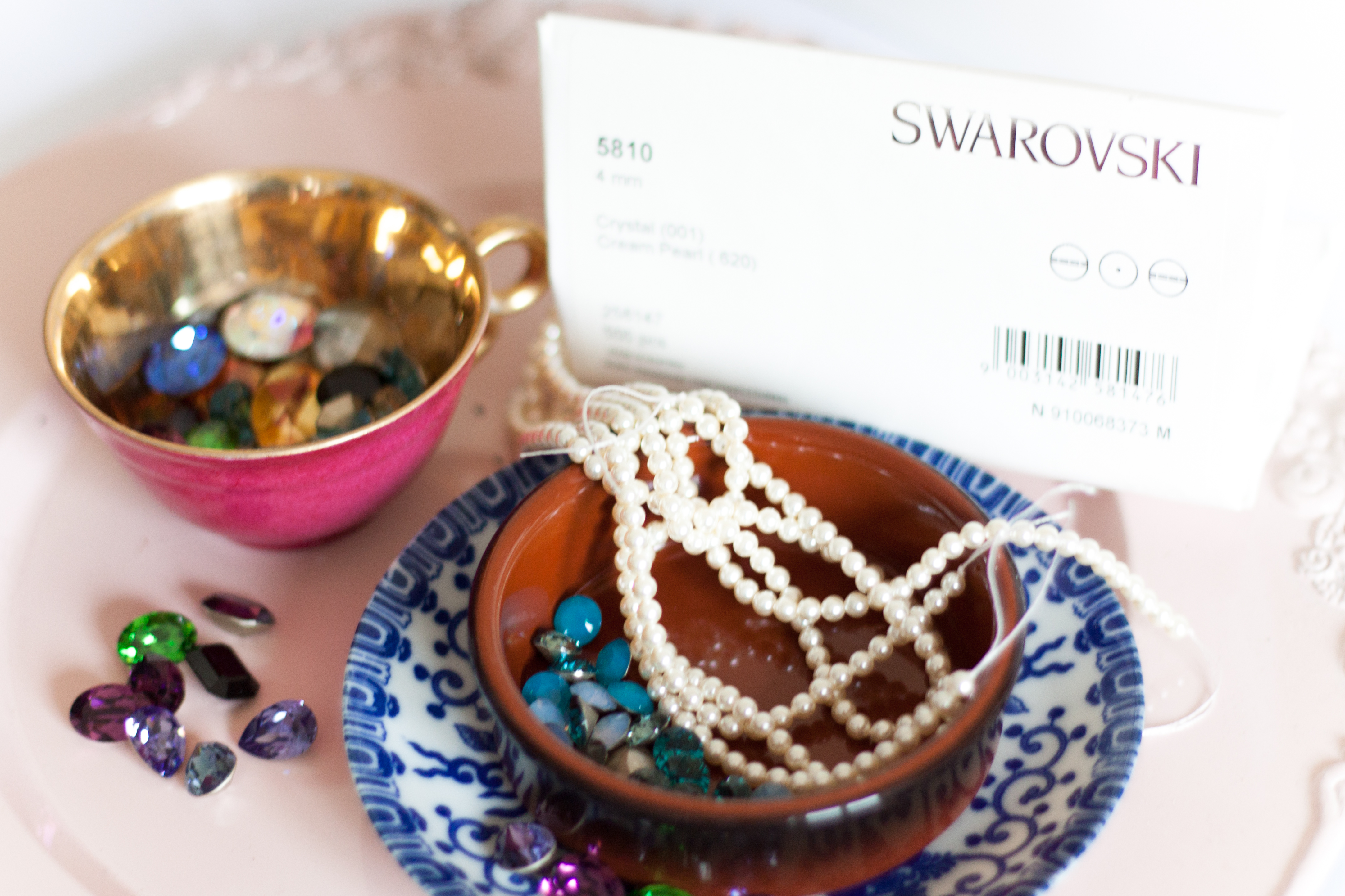 Je travaille avec Swarovski Elements tout simplement parce que je n’ai rien vu de mieux en terme de qualité et de nuancier, je continue toujours de m’extasier devant les nouveautés que je commande . Ca brille, ça fait pétiller les yeux et mon âme de Princesse Disney . Mais un Cristal Swarovski brille … comme un Cristal Swarovski. Ca ne s’explique pas, ça se contemple, ça se tourne dans tous les sens pour en admirer les reflets. Les finitions sont à tomber, et je n’utilise à présent que des perles nacrées de chez Swarovski pour leur grande résistance aux frottements et leur qualité de pigmentation.